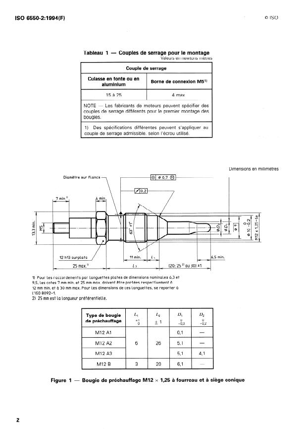 Véhicules routiers — Bougies de préchauffage du type à fourreau et à siège conique, et leur logement dans la culasse — Partie 2: Bougies M12 x 1,25