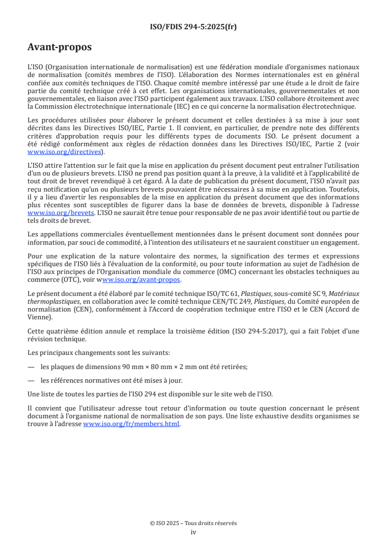 Cette quatrième édition annule et remplace la troisième édition (ISO 294-5:2017), qui a fait l'objet d'une