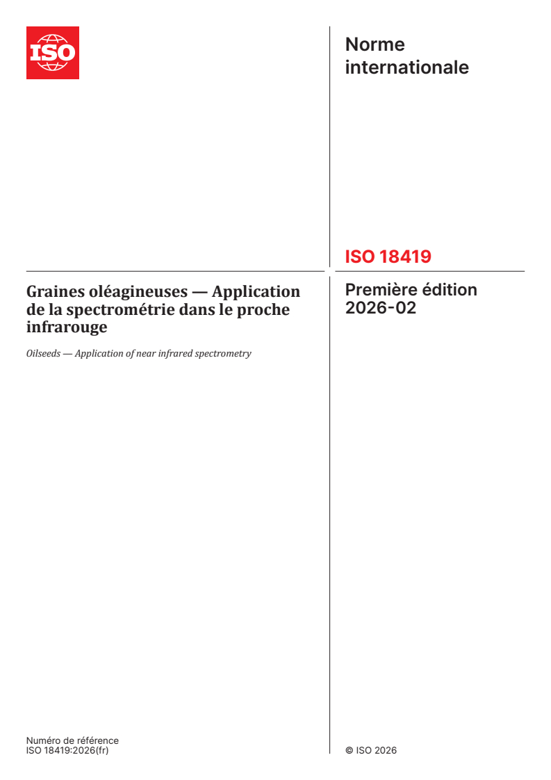 ISO 18419:2026 - Graines oléagineuses — Application de la spectrométrie dans le proche infrarouge Released:2/9/2026