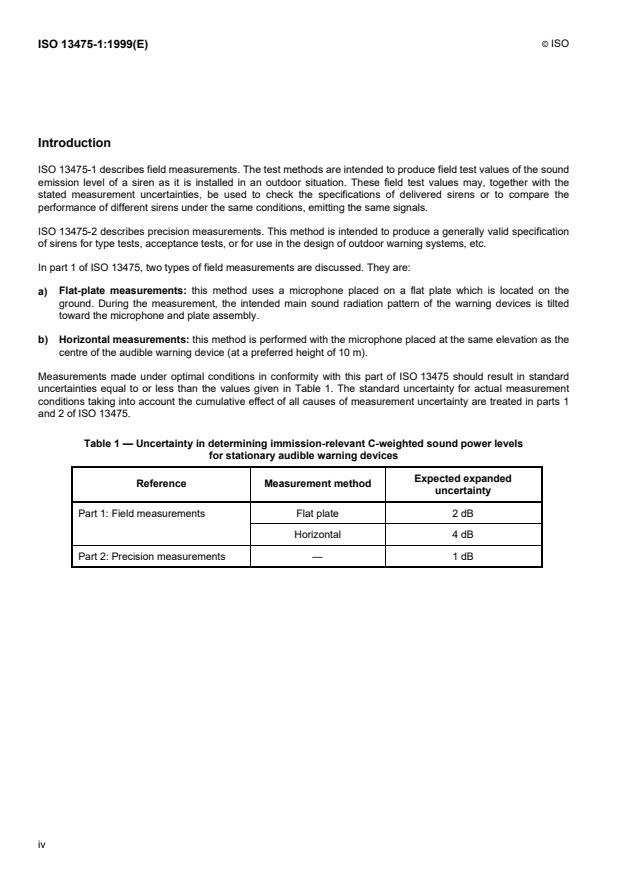 Keywords: ISO 13475-1, stationary audible warning devices, field measurements, siren sound emission, outdoor warning systems, sound pressure level, flat-plate method, horizontal method, measurement uncertainty.