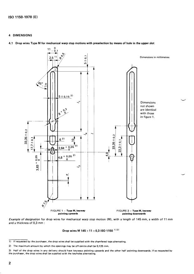 Descripton : textile machinery, drop wires, warp stop motions, dimensions, dimensional tolerances.