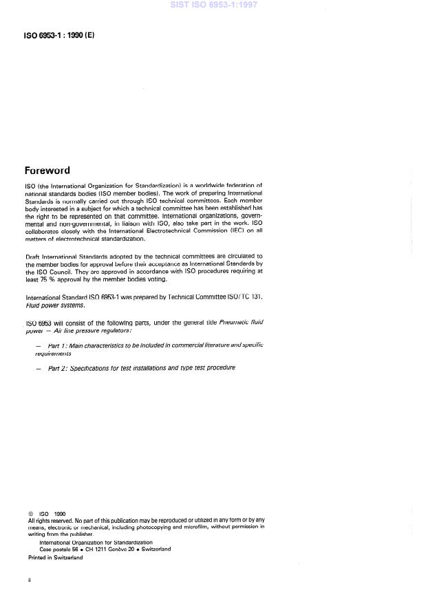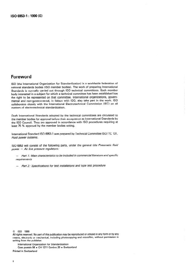 ISO 6953-1:1990 is a standard published by the International Organization for Standardization (ISO). Its full title is "Pneumatic fluid power — Air line pressure regulators — Part 1: Main characteristics to be included in commercial literature and specific requirements". This standard covers: Pneumatic fluid power — Air line pressure regulators — Part 1: Main characteristics to be included in commercial literature and specific requirements