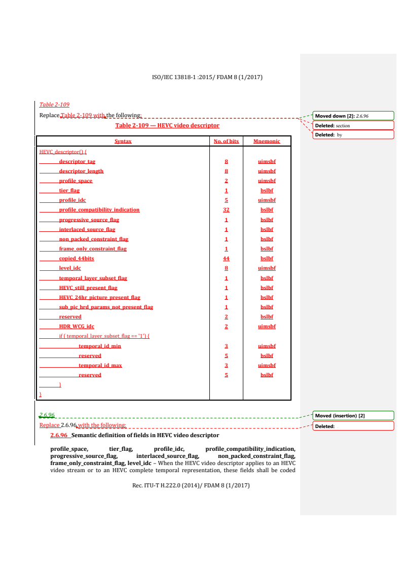 REDLINE ISO/IEC 13818-1:2015/FDAmd 8 - Information technology — Generic coding of moving pictures and associated audio information — Part 1: Systems — Amendment 8: Signaling HDR and WCG video content in MPEG-2 systems Released:3/29/2017