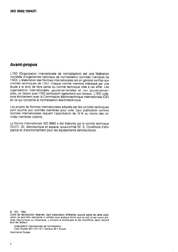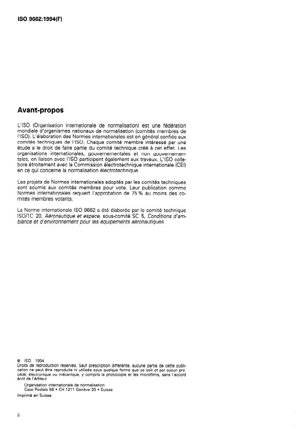 ISO 9662:1994 is a standard published by the International Organization for Standardization (ISO). Its full title is "Aircraft equipment - Environmental and operating conditions for airborne equipment - Humidity, temperature and pressure tests". This standard covers: Applies primarily to civil and transport aircraft and specifies the test requirements and various test procedures for aerospace equipment which could be subjected to moisture ingress, frosting and condensation, resulting from the passage through atmospheric conditions of high humidity, in combination with or induced by changing temperature and pressure.