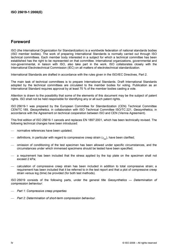 ISO 25619-1:2008 is a standard published by the International Organization for Standardization (ISO). Its full title is "Geosynthetics — Determination of compression behaviour — Part 1: Compressive creep properties". This standard covers: ISO 25619-1:2008 specifies index test methods for determining the compressive creep properties of geosynthetic products. The test specimens are subjected either to normal compressive loading or to a combination of normal compressive loading and shear loading.