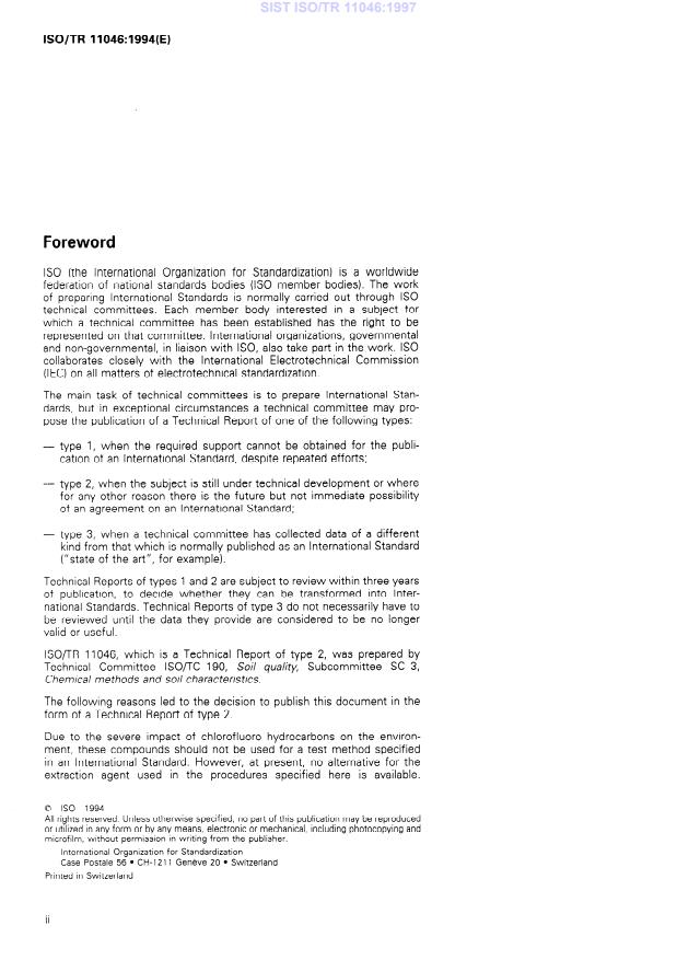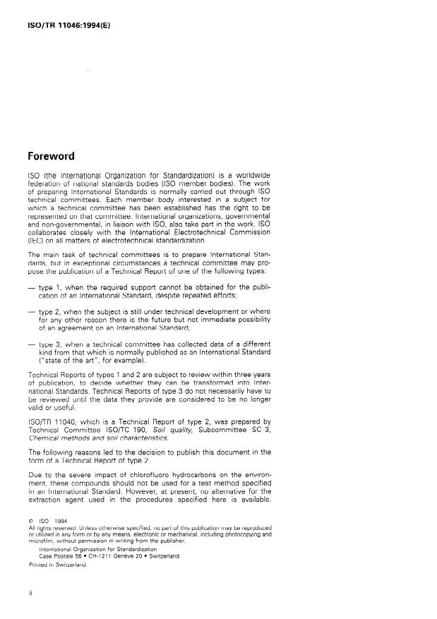 ISO/TR 11046:1994 is a technical report published by the International Organization for Standardization (ISO). Its full title is "Soil quality — Determination of mineral oil content — Method by infrared spectrometry and gas chromatographic method". This standard covers: Specifies two methods for the quantitative determination of mineral oil content in soil by IR spectrometry (method A) and gas chromatography (method B). Method A is applicable to mineral oil contents above 20 mg/kg on a dry matter basis, method B to those above 100 mg/kg. Petrol cannot be determined quantitatively with these methods, due to loss of volatile compounds during sample pretreatment. Weak polar compounds of recent biogenic origin may be determined as mineral oil. Relatively high contents of polar compounds give interferences in the determination. Halogenated hydrocarbons also may interfere.