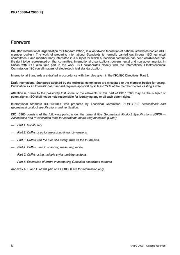 ISO 10360-4:2000 is a standard published by the International Organization for Standardization (ISO). Its full title is "Geometrical Product Specifications (GPS) — Acceptance and reverification tests for coordinate measuring machines (CMM) — Part 4: CMMs used in scanning measuring mode". This standard covers: La présente partie de l'ISO 10360 spécifie l'essai de réception qui vérifie que les performances des machines à mesurer tridimensionnelles (MMT) utilisées en mode de mesure par scanning sont conformes à ce qui est spécifié par le fabricant. Elle spécifie aussi l'essai de vérification périodique qui permet à l'utilisateur de vérifier périodiquement les performances des MMT utilisées en mode de mesure par scanning.L'essai de réception et l'essai de vérification périodique décrits dans la présente partie de l'ISO 10360 s'appliquent uniquement aux MMT pouvant réaliser des scannings en utilisant tout type de systèmes de palpage à contact.