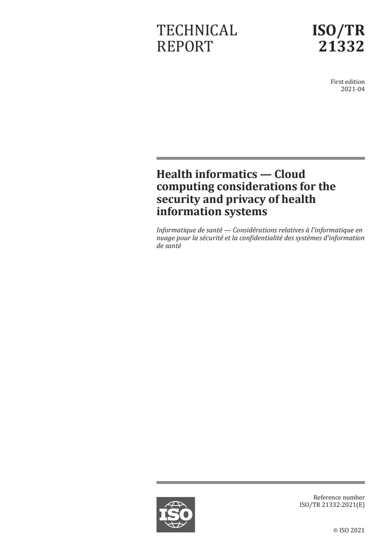 ISO/TR 21332:2021 is a technical report published by the International Organization for Standardization (ISO). Its full title is "Health informatics - Cloud computing considerations for the security and privacy of health information systems". This standard covers: This document provides an overview of security and privacy considerations for Electronic Health Records (EHR) in a cloud computing service that users can leverage when selecting a service provider.