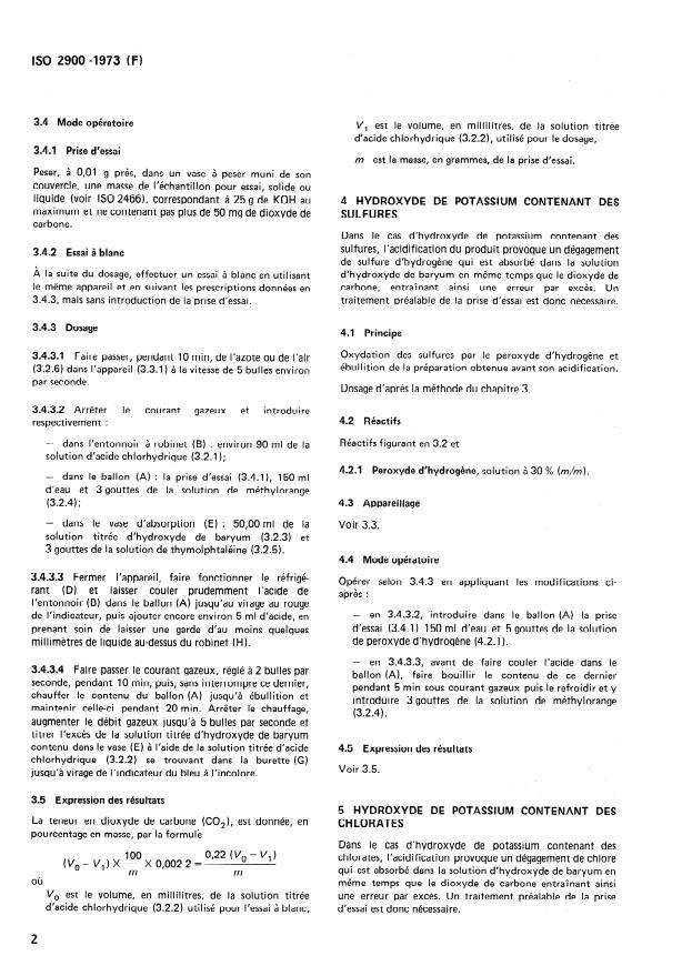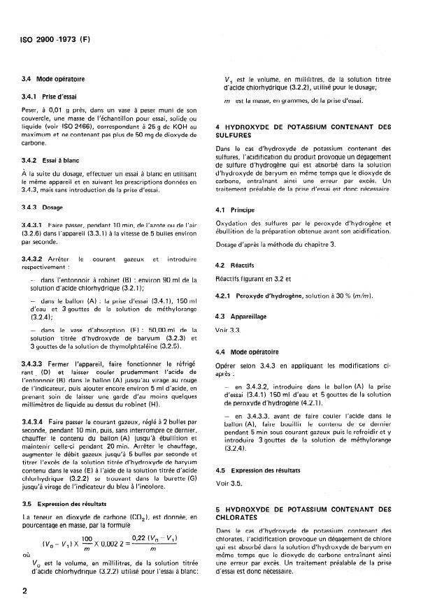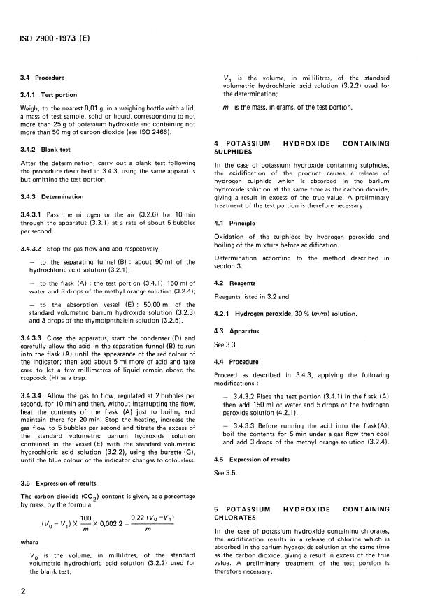 ISO 2900:1973 is a standard published by the International Organization for Standardization (ISO). Its full title is "Potassium hydroxide for industrial use — Determination of carbon dioxide content — Titrimetric method". This standard covers: Applicable to products having CO2 contents of more than 0.01 % (m/m). Three cases are envisaged. The product containing neither sulphides nor chlorates or containing sulphides or chlorates. The principle in presence of neither sulphides nor chlorates consists in liberation of carbon dioxide in a flow of gas and absorption in an excess of standard volumetric barium hydroxide solution. Titration of the excess with standard volumetric hydrochloric acid solution in the presence of thymolphthalein as indicator. In presence of sulphides, pretreatment by oxidation of the sulphides by hydrogen peroxide and boiling, in presence of chlorates, pretreatment by reduction of the chlorates to chlorides by the addition of iron(II) sulphate.