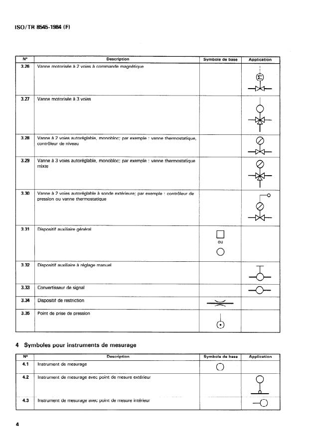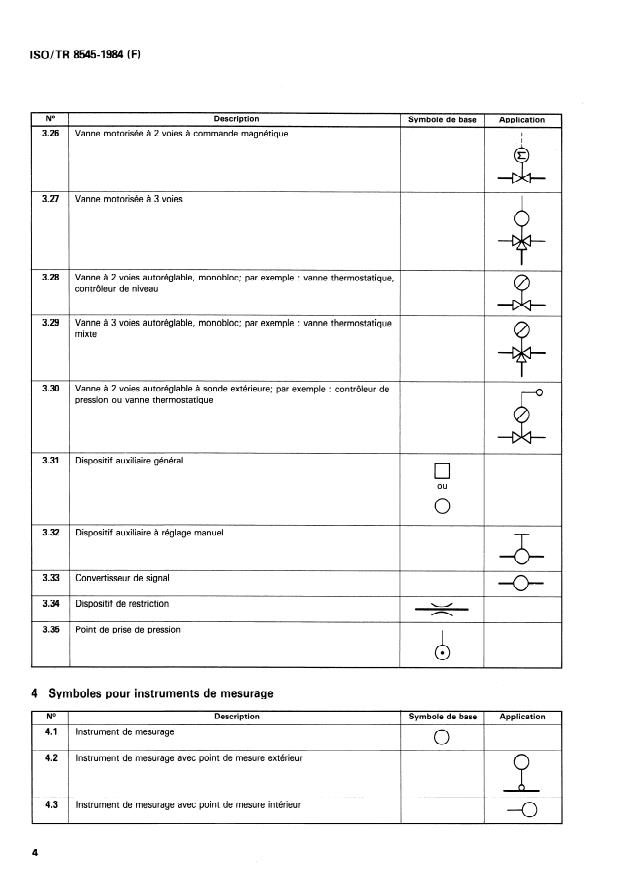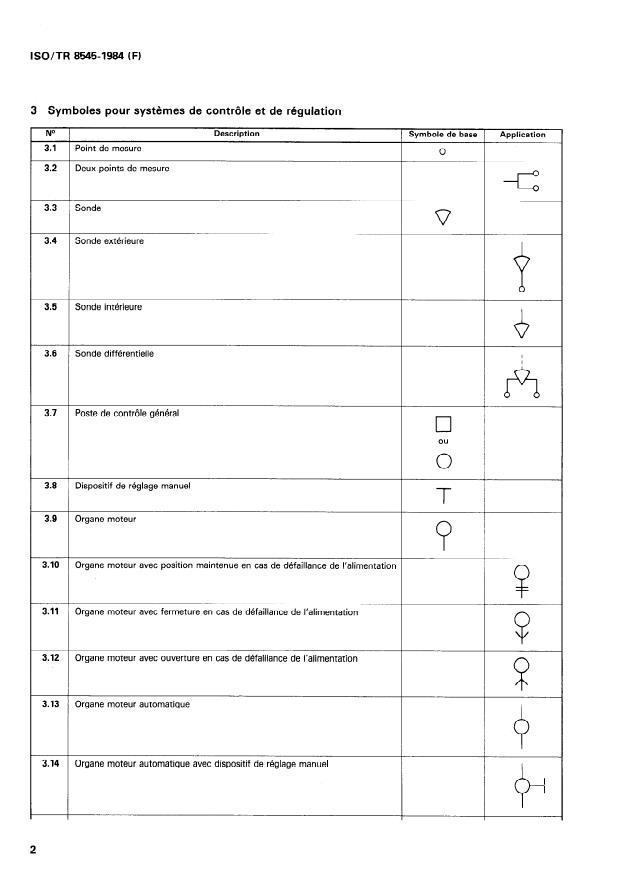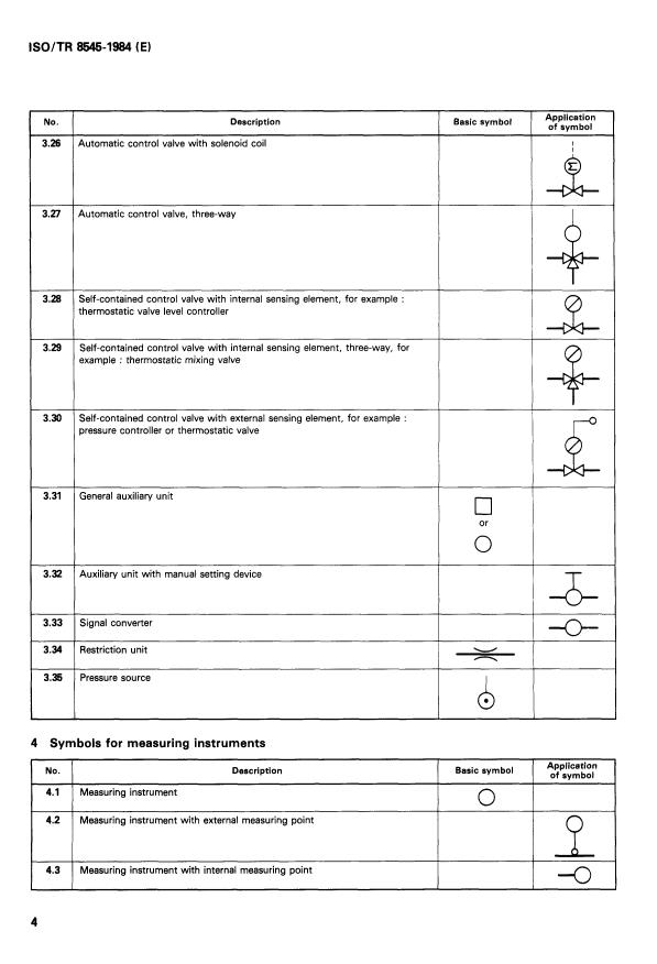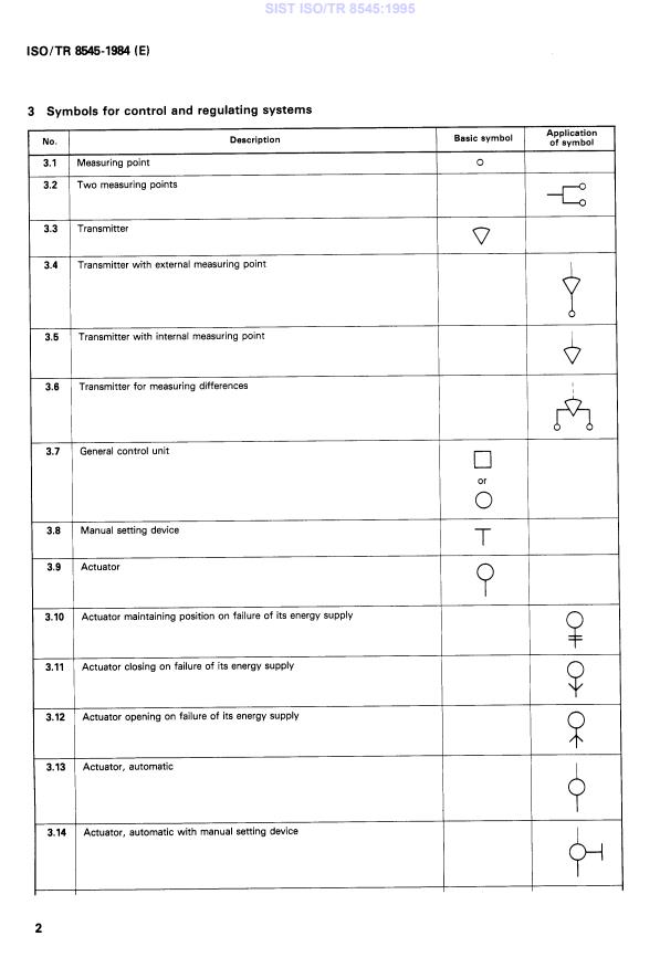 ISO/TR 8545:1984 is a technical report published by the International Organization for Standardization (ISO). Its full title is "Technical drawings — Installations — Graphical symbols for automatic control". This standard covers: The majority of symbols are shown in conjunction with their corresponding functional connection lines. The size of the symbols shall be related to the scale of the drawing. If a more detailed representation is required, symbols can be combined with designations indicated on the drawing or in a separate schedule. For representation on flow sheets for more advanced process systems, ISO 3511/1 is recommended.