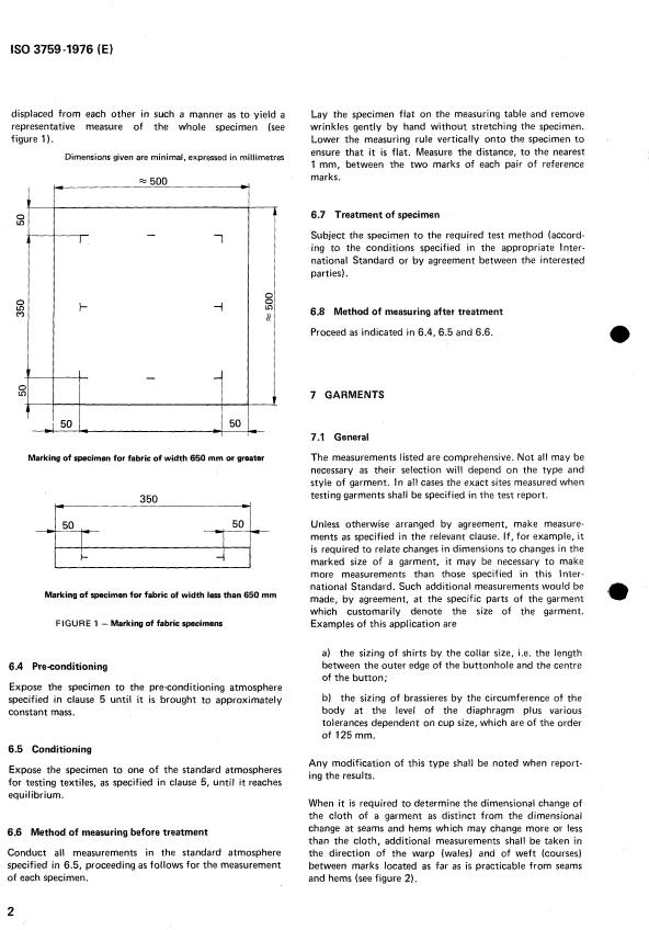 ISO 3759:1976 is a standard published by the International Organization for Standardization (ISO). Its full title is "Textiles — Preparation, marking and measuring of fabric specimens and garments in tests for determination of dimensional change". This standard covers: Textiles — Preparation, marking and measuring of fabric specimens and garments in tests for determination of dimensional change