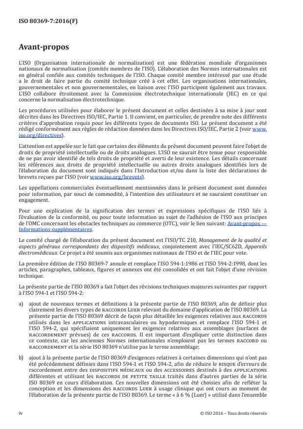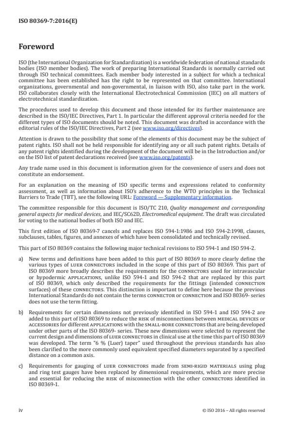 ISO 80369-7:2016 is a standard published by the International Organization for Standardization (ISO). Its full title is "Small-bore connectors for liquids and gases in healthcare applications — Part 7: Connectors for intravascular or hypodermic applications". This standard covers: ISO 80369-7:2016 specifies dimensions and requirements for the design and functional performance of small-bore connectors intended to be used for connections in intravascular applications or hypodermic connections in hypodermic applications of medical devices and accessories. EXAMPLES Hypodermic syringes and needles or intravascular (IV) cannulae with male and female luer slip connectors and luer lock connectors. NOTE 1 The luer connector was originally designed for use at pressures up to 300 kPa. ISO 80369-7:2016 does not specify requirements for the medical devices or accessories that use these connectors. Such requirements are given in particular International Standards for specific medical devices or accessories. ISO 80369-7:2016 does not specify requirements for the following small-bore connectors, which are specified in other International Standards: - haemodialyser, haemodiafilter and haemofilter blood compartment ports (ISO 8637 and applicable portion of ISO 8638 referencing blood compartment ports); - haemodialysis, haemodiafiltration and haemofiltration equipment connectors (ISO 8637); - infusion system closure piercing connectors (ISO 8536‑4). NOTE 2 Manufacturers are encouraged to incorporate the small-bore connectors specified in this part of ISO 80369 into medical devices or accessories, even if currently not required by the relevant particular medical device standards. It is expected that when the relevant particular medical device standards are revised, requirements for small-bore connectors, as specified in ISO 80369, will be included. NOTE 3 ISO 80369‑1:2010, 5.8, specifies alternative methods of compliance with ISO 80369‑1:2010, for small-bore connectors intended for use with intravascular applications or hypodermic application medical devices or accessories, which do not comply with this part of ISO 80369.