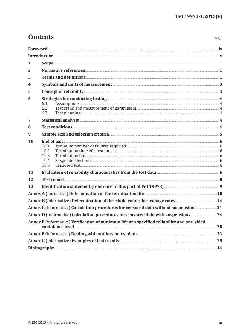 ISO 19973-1:2015 is a standard published by the International Organization for Standardization (ISO). Its full title is "Pneumatic fluid power — Assessment of component reliability by testing — Part 1: General procedures". This standard covers: ISO 19973-1:2015 provides general procedures, the calculation method for assessing the reliability of pneumatic fluid power components and the methods of reporting. These procedures are independent of the kinds of components and of their design. ISO 19973-1:2015 also provides general test conditions and a method for data evaluation. NOTE Because the service life of any component is subject to variations, a statistical evaluation assists the interpretation of the test results. The methods specified in this part of ISO 19973 apply to the first failure without repairs (see IEC 60300‑3‑5), but exclude outliers; however, because outliers can be highly significant, information about how to deal with them is given in Annex F.