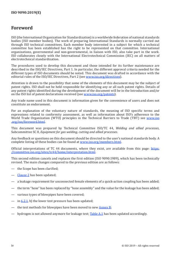 ISO 9090:2019 - "Gas tightness of equipment for gas welding and allied processes" specifies acceptable maximum external gas leakage rates and measurement procedures for components used in the gas supply to a blowpipe (from the hose outlet or cylinder valve to the blowpipe). It covers individual components (regulators, blowpipes, safety devices, quick‑action couplings, hose assemblies, etc.) but does not apply to gas supply plants. Individual product standards (for example ISO 9012 for some hand blowpipes) take precedence for test method details.