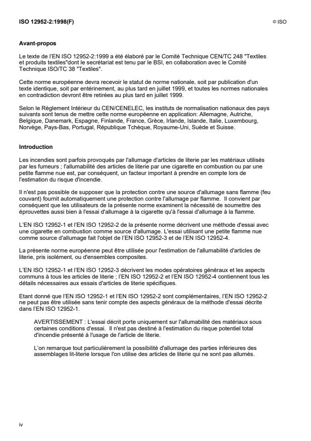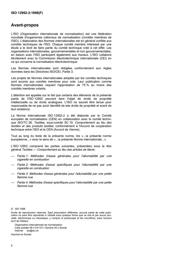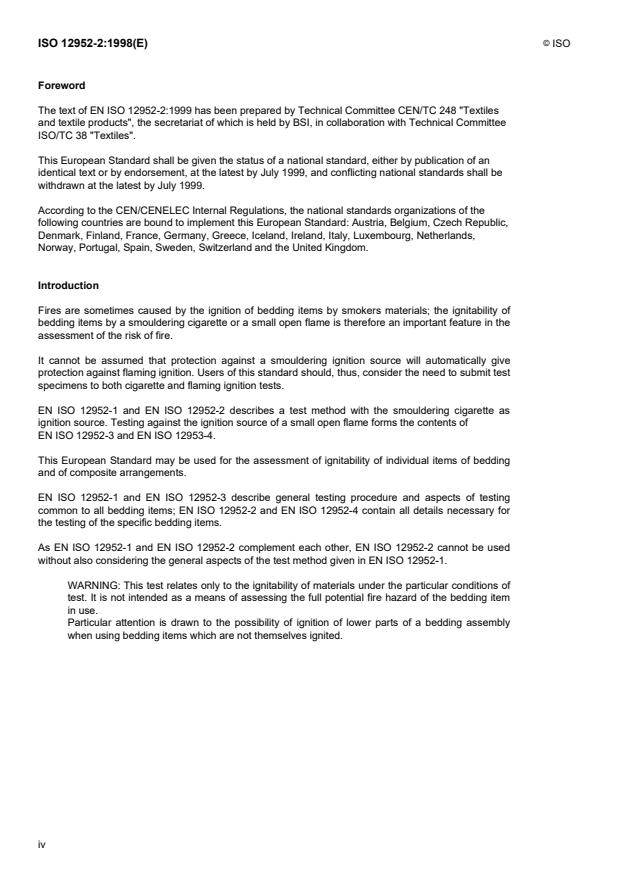 ISO 12952-2:1998 is a standard published by the International Organization for Standardization (ISO). Its full title is "Textiles — Burning behaviour of bedding items — Part 2: Specific test methods for the ignitability by a smouldering cigarette". This standard covers: Textiles — Burning behaviour of bedding items — Part 2: Specific test methods for the ignitability by a smouldering cigarette
