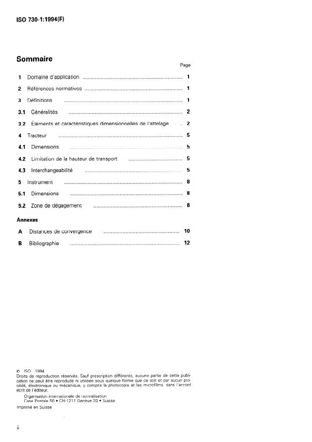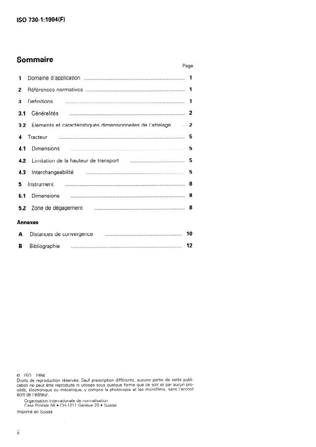 La présente partie de l'ISO 730 prescrit les dimensions et les exigences requises des attelages trois points permettant d'atteler des instruments ou des équipements à l'arrière des tracteurs agricoles à roues. Elle spécifie quatre catégories qui sont utilisées sur les différentes gammes de tracteurs agricoles indiquées dans le tableau 1. La catégorie 4 a été divisée en deux parties, «4L» et «4H», suivant l'emplacement de la prise de force. Les dimensions des catégories 4L et 4H sont applicables aux tracteurs dont la position de la prise de force se situe, respectivement, au-dessous et au-dessus de l'axe de l'essieu arrière. Les dimensions et les exigences requises des attelages trois points permettant d'atteler des instruments ou équipements à l'avant des tracteurs agricoles sont données dans l'ISO 8759-2[3].