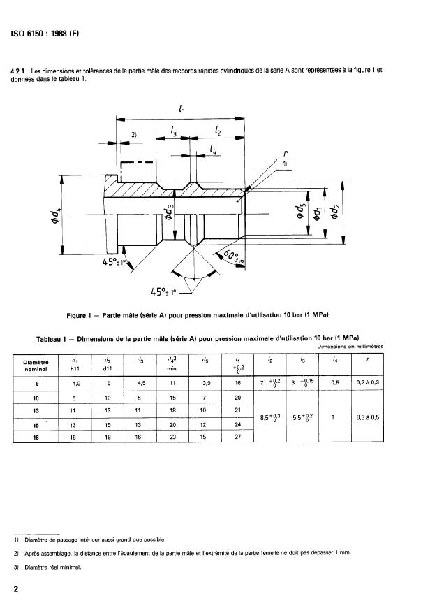 ISO 6150:1988 - Transmissions pneumatiques -- Raccords rapides cylindriques pour pressions maximales d'utilisation 10 bar, 16 bar et 25 bar (1 MPa, 1,6 MPa et 2,5 MPa) -- Dimensions de raccordement de la partie mâle, spécifications, conseils d'utilisation et essais