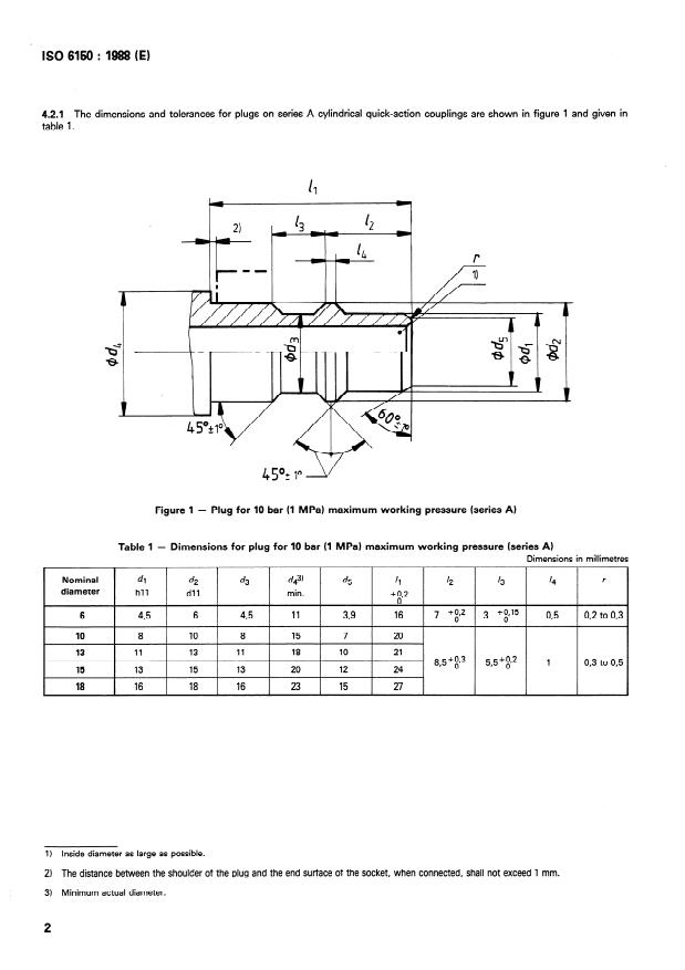 ISO 6150:1988 is a standard published by the International Organization for Standardization (ISO). Its full title is "Pneumatic fluid power — Cylindrical quick-action couplings for maximum working pressures of 10 bar, 16 bar and 25 bar (1 MPa, 1,6 Mpa, and 2,5 MPa) — Plug connecting dimensions, specifications, application guidelines and testing". This standard covers: Lays down the dimensions and tolerances so as to ensure the interchangeability of pneumatic coupling plugs. Gives also specifications and guidelines, and specifies the tests to be applied to the plugs together with sockets. Applies only to the dimensional criteria of products; it does not apply to their functional characteristics.