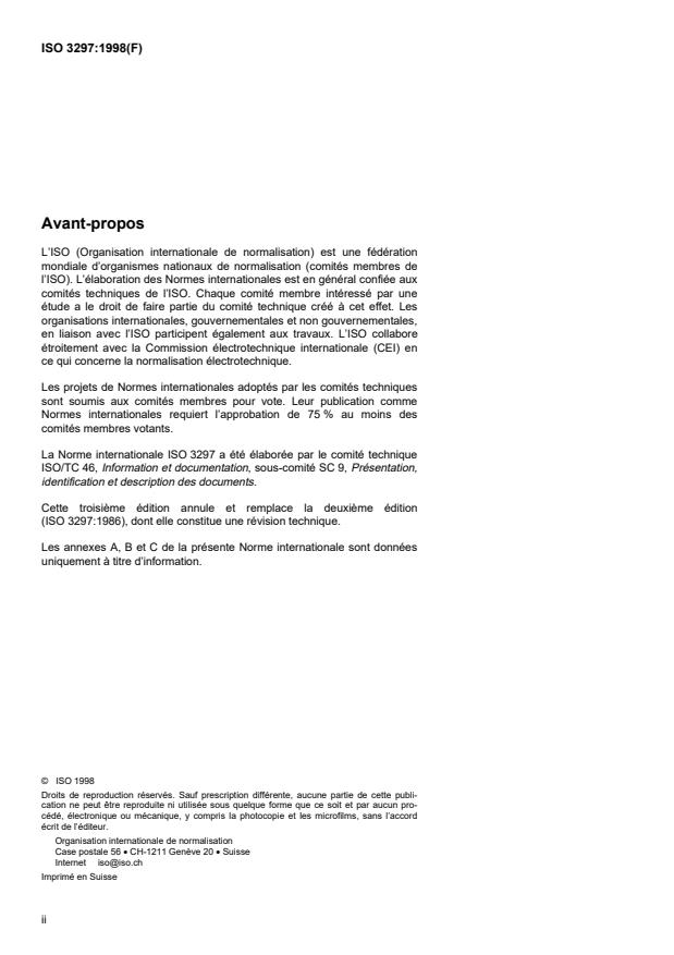 ISO 3297:1998 is a standard published by the International Organization for Standardization (ISO). Its full title is "Information and documentation — International standard serial number (ISSN)". This standard covers: La présente Norme internationale a pour objet de définir et encourager l'emploi d'un code normalisé, appelé Numéro international normalisé des publications en série (ISSN), destiné à l'identification univoque des publications en série.Chaque ISSN est un identificateur unique d'une publication en série.La présente Norme internationale est applicable à l'ensemble des publications en série, qu'elles soient passées, présentes ou à paraître dans un avenir prévisible, quel que soit le support physique de la publication. Les publications en série comprennent les périodiques, journaux, publications annuelles (telles que rapports, annuaires, répertoires), revues, collections, mémoires, comptes rendus, actes, etc. des sociétés.Les monographies, rapports techniques, enregistrements sonores et visuels, ainsi que les documents de musique imprimée ont leurs propres systèmes de numérotation et ne sont donc pas explicitement concernés par la présente Norme internationale. Toutefois, ces documents peuvent porter un ISSN en complément de leurs propres numéros normalisés lorsqu'ils font partie d'une publication en série.