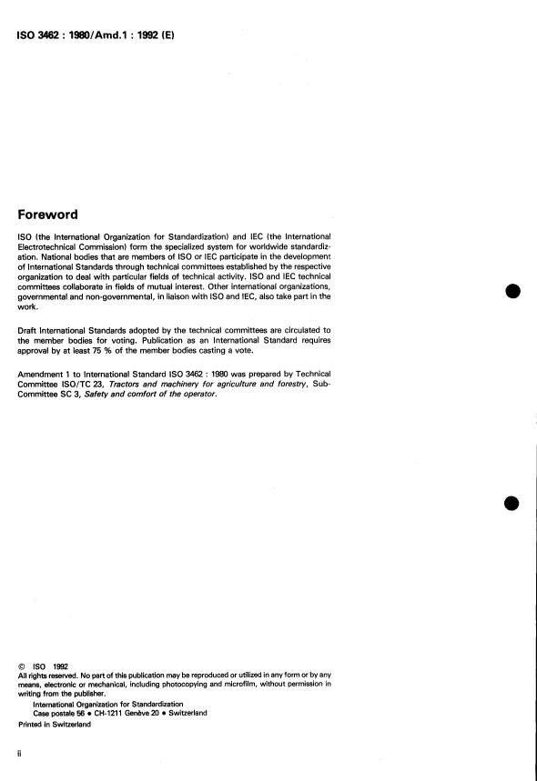 ISO 3462:1980/Amd 1:1992 is a standard published by the International Organization for Standardization (ISO). Its full title is "Tractors and machinery for agriculture and forestry — Seat reference point — Method of determination — Amendment 1". This standard covers: Tractors and machinery for agriculture and forestry — Seat reference point — Method of determination — Amendment 1