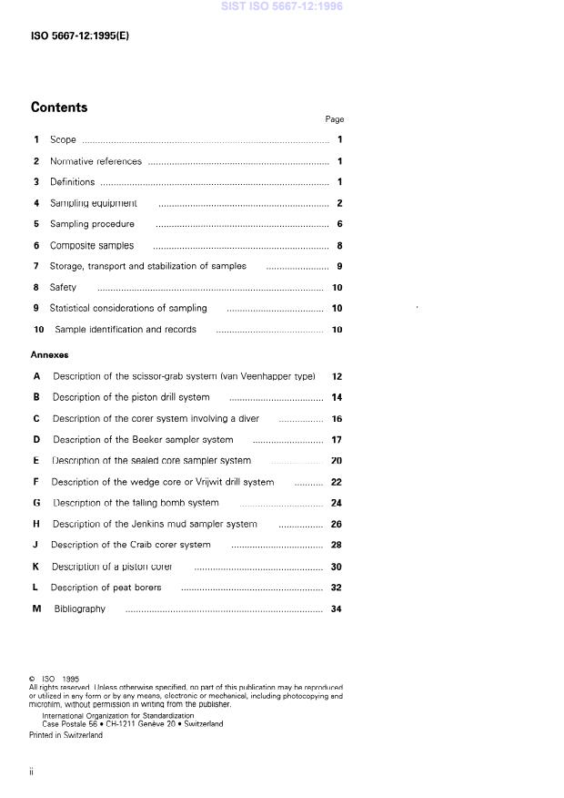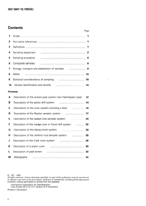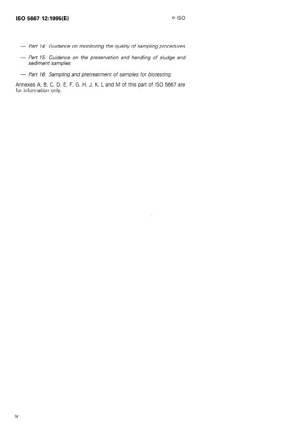 ISO 5667-12:1995 is a standard published by the International Organization for Standardization (ISO). Its full title is "Water quality — Sampling — Part 12: Guidance on sampling of bottom sediments". This standard covers: Provides guidance on the sampling of sediments from rivers, streams, lakes and similar standing waters and estuarines. Sampling of industrial and sewage works sludges and ocean sediments are excluded.