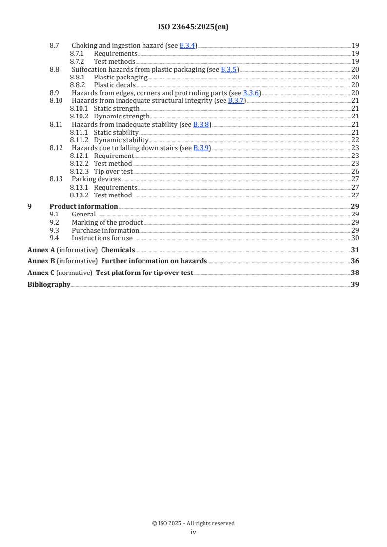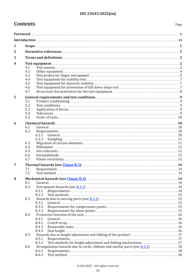 ISO 23645:2025 covers both chemical and physical safety risks and describes the required test equipment and procedures. Major technical topics include: