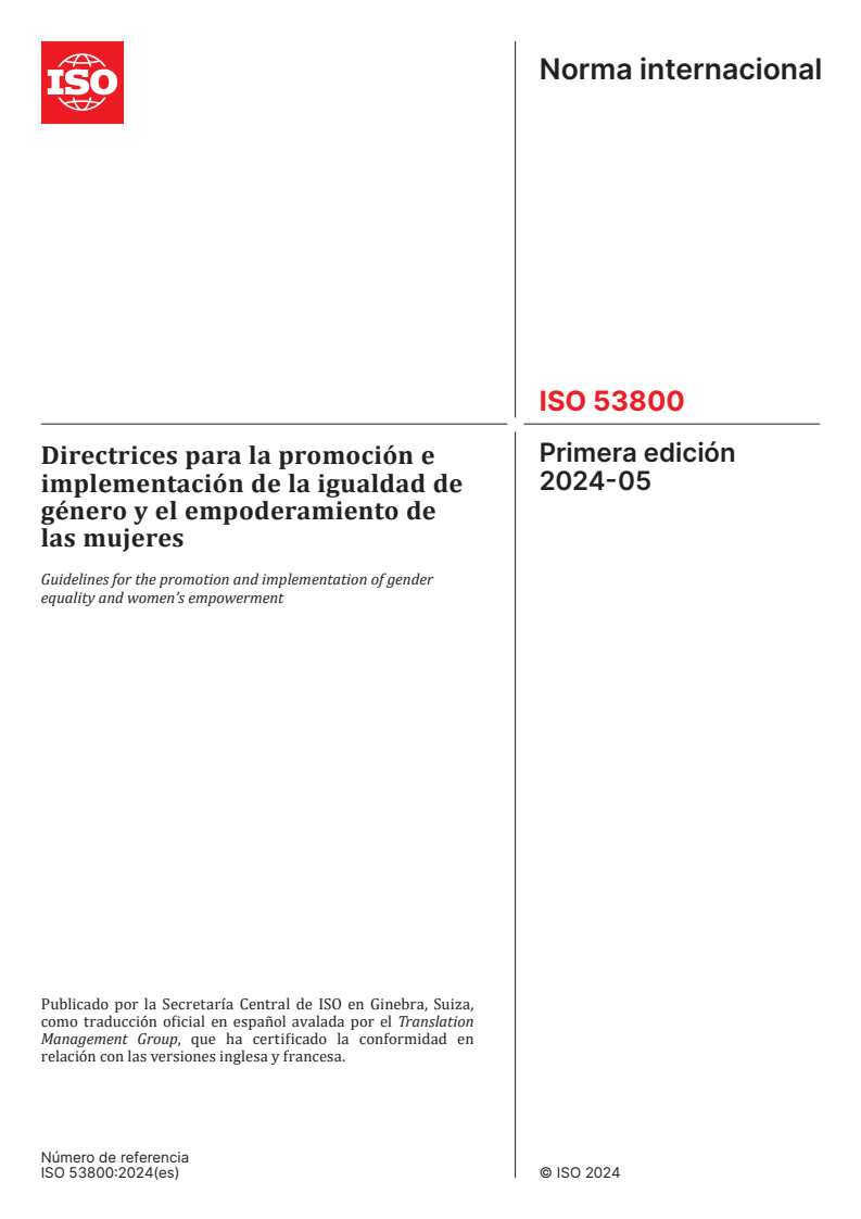 ISO 53800:2024 - Lignes directrices relatives a la promotion et a la mise en ouvre de l’égalité entre les femmes et les hommes et a l’empouvoirement des femmes Released:15. 05. 2024