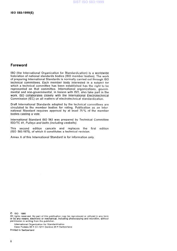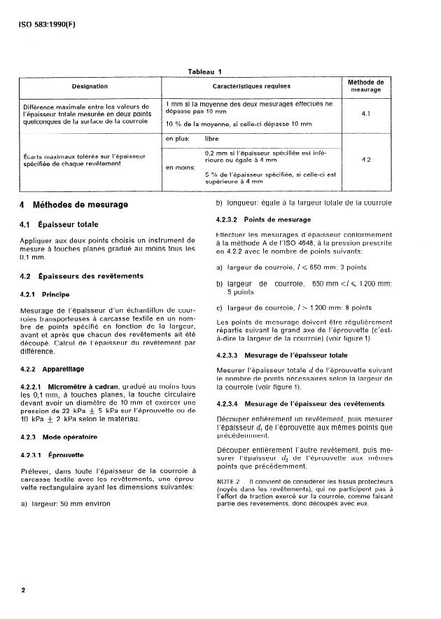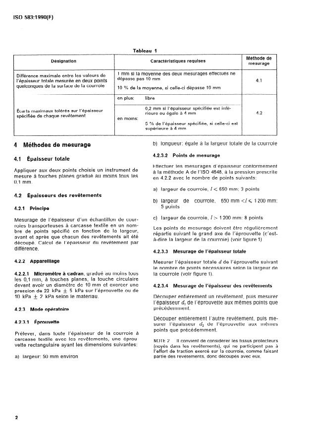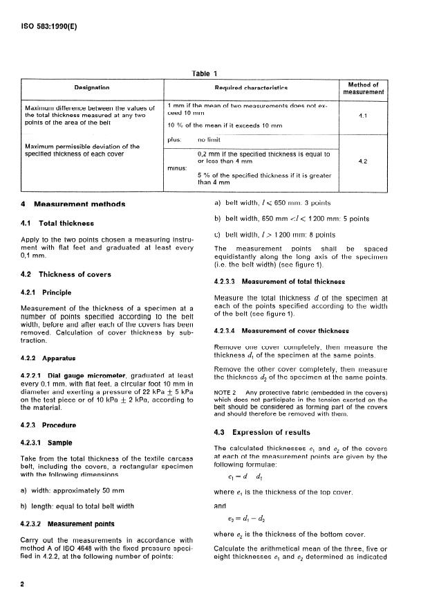 ISO 583:1990 is a standard published by the International Organization for Standardization (ISO). Its full title is "Conveyor belts with a textile carcass — Tolerances on total thickness and thickness of covers — Direct measurement method". This standard covers: Specifies: a) the maximum difference between the total thickness measured at any two points of the area of a conveyor belt; b) the permissible deviations on the thickness of each cover; c) the appropriate methods of measurement. Applies only to belts with a textile or an aramide carcass. This second edition cancels and replaces the first edition (1975).