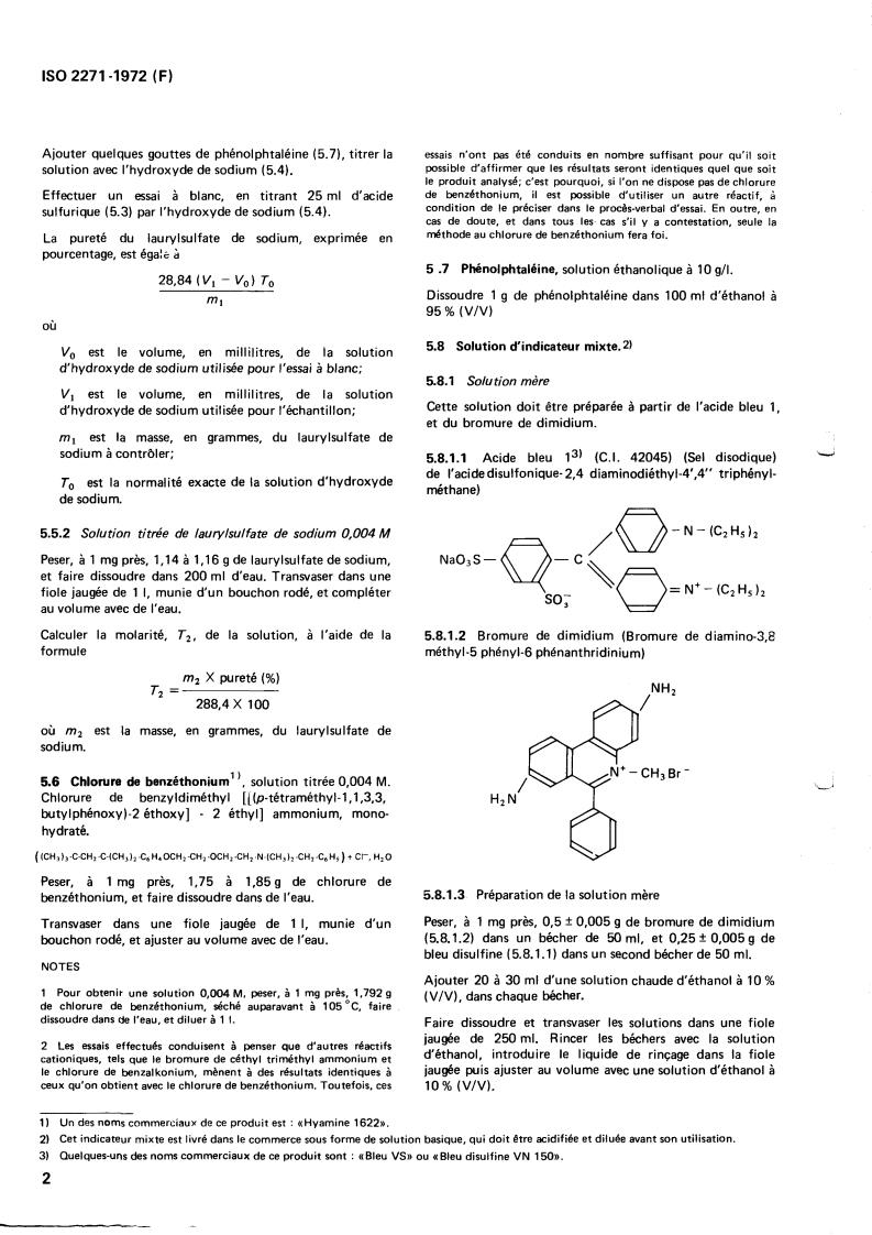 ISO 2271:1972 is a standard published by the International Organization for Standardization (ISO). Its full title is "Surface active agents — Detergents — Determination of anionic-active matter (Direct two-phase titration procedure)". This standard covers: Surface active agents — Detergents — Determination of anionic-active matter (Direct two-phase titration procedure)