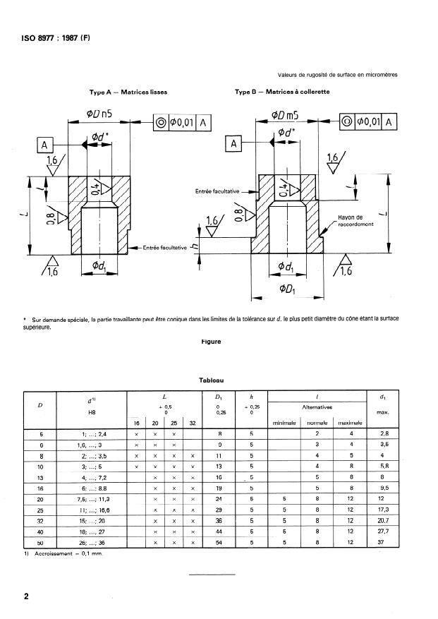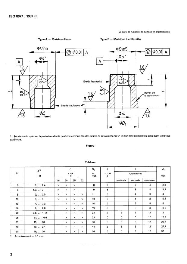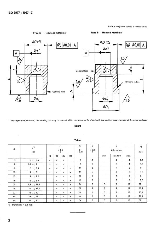 ISO 8977:1987 is a standard published by the International Organization for Standardization (ISO). Its full title is "Tools for pressing — Round matrixes". This standard covers: Lays down the basic dimensions and tolerances in millimetres for round matrixes in the outside diameter range of 5 to 50 mm. Gives example of materials and ahrdness, and specifies a designation of matrixes. The main use of matrixes defined in ISO 8977 is for punching holes in steel sheet of other materials.