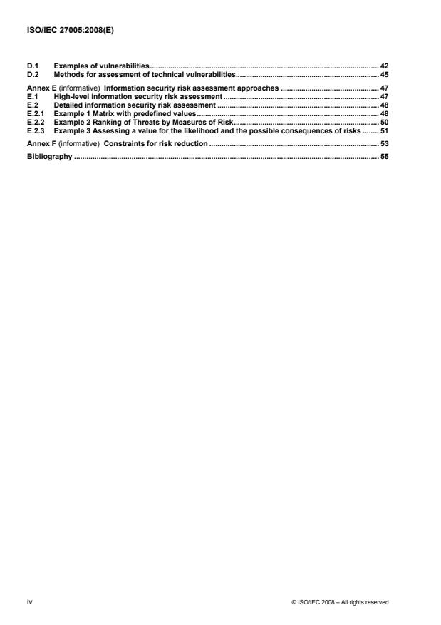 Information security risk assessment approaches.47 E.1 High-level information security risk assessment.47 E.2 Detailed information security risk assessment.48 E.2.1 Example 1 Matrix with predefined values.48 E.2.2 Example 2 Ranking of Threats by Measures of Risk.50 E.2.3 Example 3 Assessing a value for the likelihood and the possible consequences of risks.51 Annex F (informative)