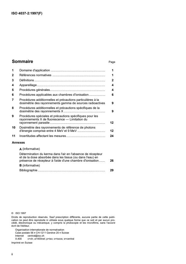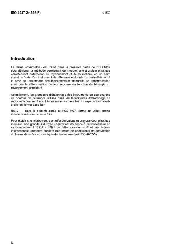 ISO 4037-2:1997 is a standard published by the International Organization for Standardization (ISO). Its full title is "X and gamma reference radiation for calibrating dosemeters and doserate meters and for determining their response as a function of photon energy — Part 2: Dosimetry for radiation protection over the energy ranges from 8 keV to 1,3 MeV and 4 MeV to 9 MeV". This standard covers: La présente partie de l'ISO 4037 définit les procédures de dosimétrie des rayonnements X et gamma de référence destinés à l'étalonnage des instruments de radioprotection dans les gammes d'énergie allant approximativement de 8 keV à 1,3 MeV et de 4 MeV à 9 MeV. Les méthodes de production de ces rayonnements de référence et les débits de kerma nominaux obtenus sont donnés dans l'ISO 4037-1.