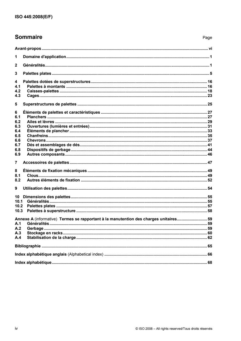 ISO 445:2008 defines terms relating to pallets for unit load methods of materials handling. It also includes an informative annex listing general terms relating to materials handling.