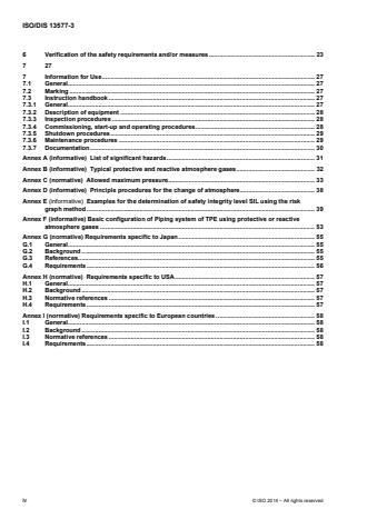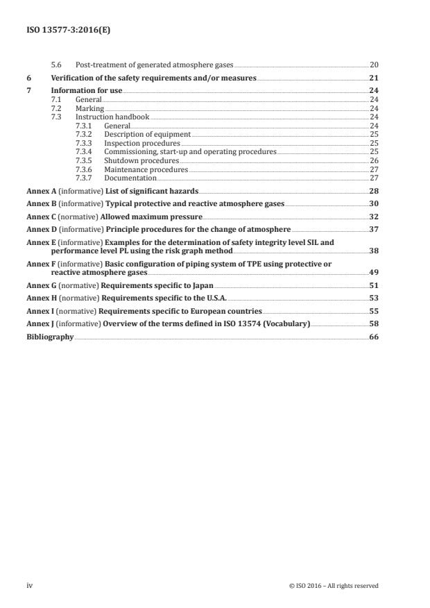 ISO 13577-3:2016 specifies safety requirements for generation and use of protective and reactive atmosphere gases that are part of industrial thermo-processing equipment (TPE). NOTE The general safety requirements common to TPE are provided in ISO 13577‑1 (see Introduction). ISO 13577-3:2016 deals with significant hazards, hazardous situations and events relevant to the generation and use of protective and reactive atmosphere gases created by thermochemical reactions and their use in TPE that are part of TPE as listed in Clause 4 and Clause 5, when used as intended and under the conditions foreseen by the manufacturer. It covers - pipework downstream of and including the manual isolating valve, - equipment for the generation of atmosphere gases, - additional equipment for the use of atmosphere gases in TPE, - safety devices, and - functional requirements for safety related control system for the generation and use of protective and reactive atmosphere gases. It applies to the supply of atmosphere gas, source gas, inert gas and process liquids to TPE and their removal from TPE, confined to equipment integrated in the TPE. ISO 13577-3:2016 also details the anticipated significant hazards associated with atmosphere gas systems and their use in TPE and specifies the appropriate preventative measures for the reduction or elimination of these hazards. The pressure hazard of the piping and components covered by this standard is within the maximum pressure/size relationship of group I as described in Annex C. It - specifies the requirements to be met to ensure the safety of persons and property during installation, commissioning, start up, operation, shutdown and maintenance, - does not cover the relevant risks involved in the flue gas ducting system when it is not considered a part of TPE, - is not applicable to utility supply upstream of the TPE main disconnects, - does not apply to TPE for semi-conductor devices, - does not apply to TPE with atmosphere, such as air and flue gas from an over stoichiometric combustion, - does not cover the decommissioning of the TPE, - does not cover vacuum furnaces, - does not deal with the hazard of noise which is covered in ISO 13577‑1, - is not applicable to generation and use of atmosphere gas in TPE and associated plant which is manufactured before the date of its publication, and - gives the necessary requirements for the information for use. A TPE designed according to ISO 13577-3:2016 does not create any potentially explosive atmosphere in the area around the TPE and is not designed to be located in an area with a potentially explosive or hazardous atmosphere. A table of typical protective and reactive gases is given in Annex B.