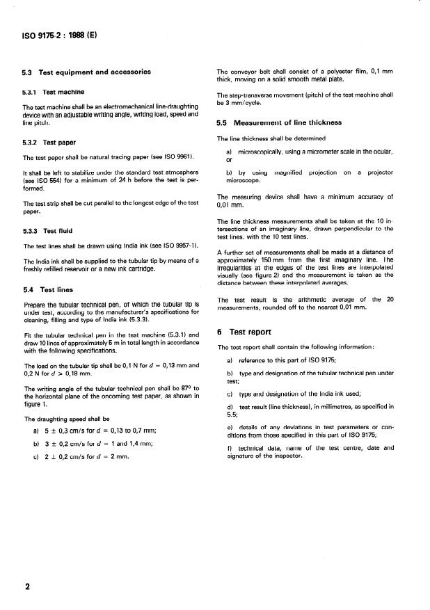 ISO 9175-2:1988 is a standard published by the International Organization for Standardization (ISO). Its full title is "Tubular tips for hand-held technical pens using India ink on tracing paper — Part 2: Performance, test parameters and test conditions". This standard covers: The requirement apply to tubular tips designated and marked in accordance with ISO 9175-1. The permissible deviations in the line thickness are given in a table and are used as a basis for the determination of the line quality. Describes the measurement of the line thickness.