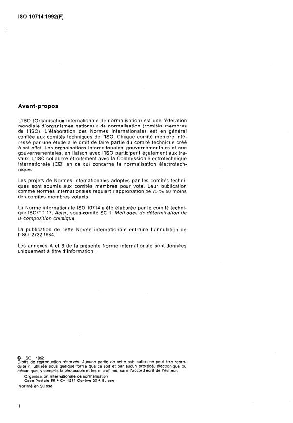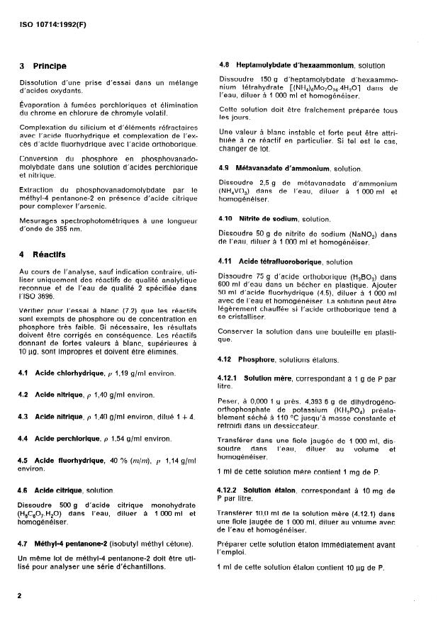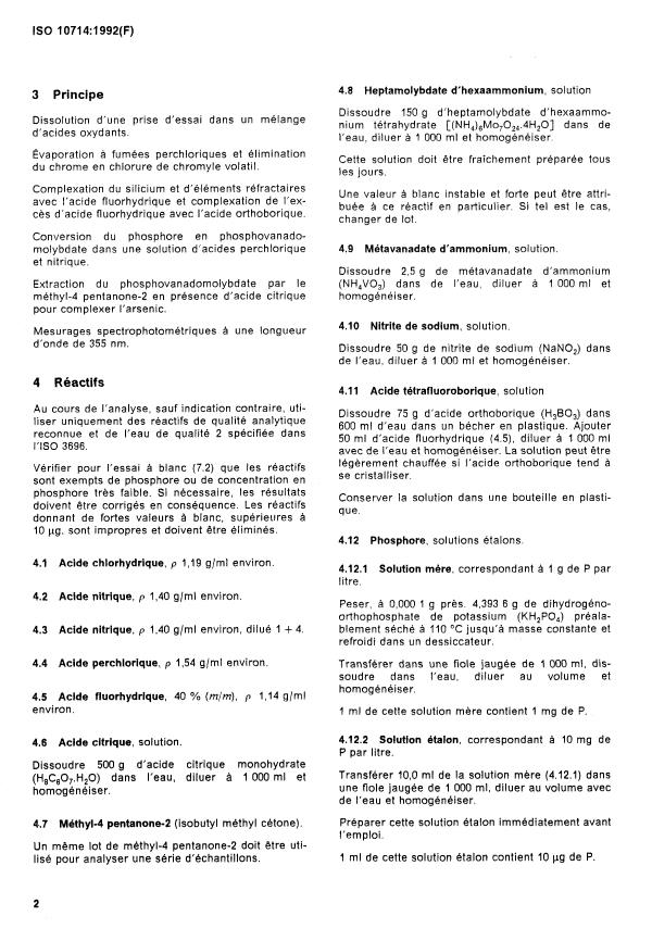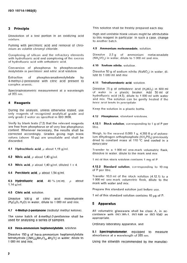 ISO 10714:1992 specifies a phosphovanadomolybdate spectrophotometric method for the determination of phosphorus in steel and iron. The method covers phosphorus contents from 0.0010% to 1.0% (m/m) and describes sample preparation, reagent requirements, colour development, extraction and spectrophotometric measurement. It replaces ISO 2732:1984 and includes informative annexes on cooperative test results and precision.