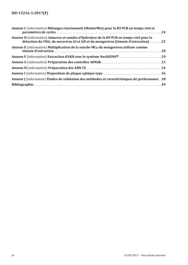 ISO 15216-1:2017 décrit une méthode de quantification des niveaux d'ARN de VHA et norovirus des génogroupes I (GI) et II (GII) présents dans des échantillons pour essai d'aliments (fruits tendres, légumes feuilles, tiges et bulbes, eau embouteillée, MBV) ou sur des surfaces alimentaires. Après libération des virus contenus dans l'échantillon pour essai, l'ARN viral est extrait par lyse à l'aide de thiocyanate de guanidine et par adsorption sur silice. Les séquences cibles de l'ARN viral sont amplifiées et détectées par la technique RT-PCR en temps réel. Cette méthode n'est pas validée pour la détection des virus ciblés dans d'autres aliments (y compris les aliments à plusieurs composants) ou d'autres matrices, ni pour la détection d'autres virus dans les aliments, sur les surfaces alimentaires ou dans d'autres matrices.