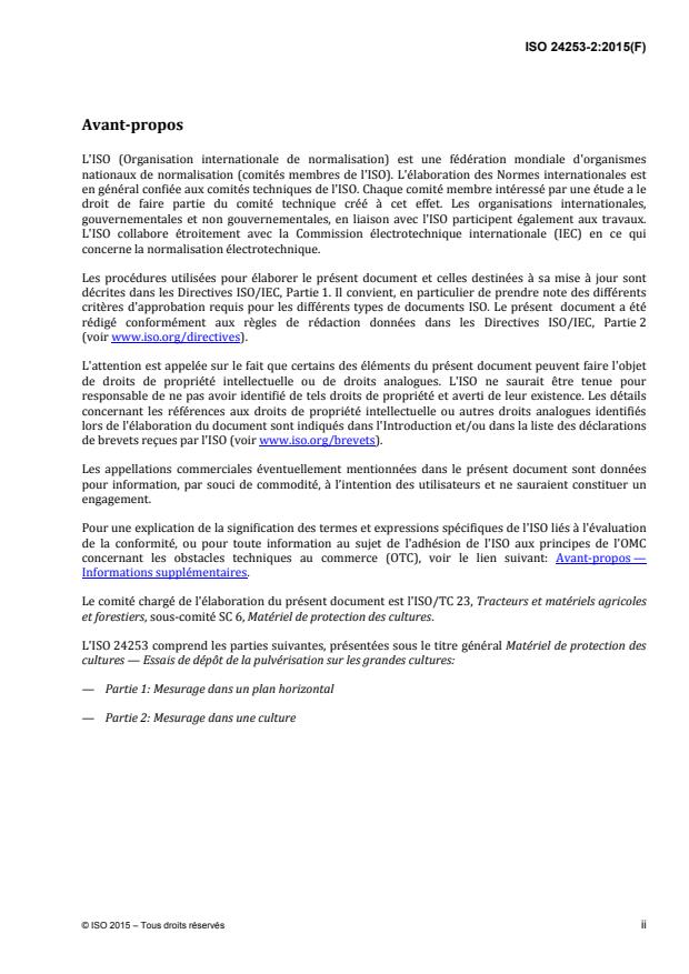 ISO 24253-2:2015 is a standard published by the International Organization for Standardization (ISO). Its full title is "Crop protection equipment — Spray deposition test for field crop — Part 2: Measurement in a crop". This standard covers: ISO 24253-2:2015 specifies a method for field measurements to determine the quantity and distribution of spray in a field crop, treated by horizontal boom sprayers with downward directed application. It can be used for nursery trees and small size bush crops (young currants) when sprayed with boom sprayers. NOTE When interested in the spray deposition over width of the crop canopy, it is advised to use ISO 22522. ISO 24253-2:2015 allows flexibility in the arrangement of field tests, but specifies standardized measurement procedures that are useful to be able to compare the results from different field experiments or to compare with laboratory tests, such as that specified in ISO 5682-2. ISO 24253 is not intended for use in or for a regulatory framework.