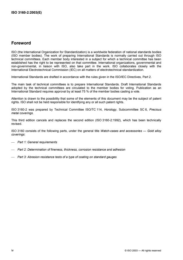 ISO 3160-2:2003 is a standard published by the International Organization for Standardization (ISO). Its full title is "Watch-cases and accessories — Gold alloy coverings — Part 2: Determination of fineness, thickness, corrosion resistance and adhesion". This standard covers: ISO 3160-2:2003 specifies methods to determine fineness, thickness, corrosion resistance and adhesion for gold alloy coverings on watch-cases and accessories, including bracelets when they are permanently attached to the case. The tests apply only to significant surfaces. ISO 3160-2:2003 applies to all gold alloy coverings specified in ISO 3160-1.