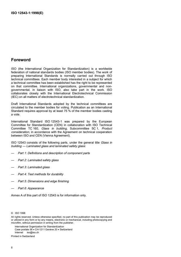 ISO 12543-1:1998 is a standard published by the International Organization for Standardization (ISO). Its full title is "Glass in building — Laminated glass and laminated safety glass — Part 1: Definitions and description of component parts". This standard covers: Glass in building — Laminated glass and laminated safety glass — Part 1: Definitions and description of component parts