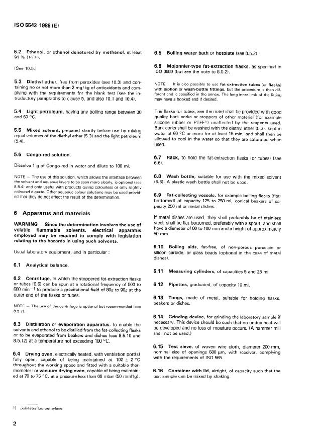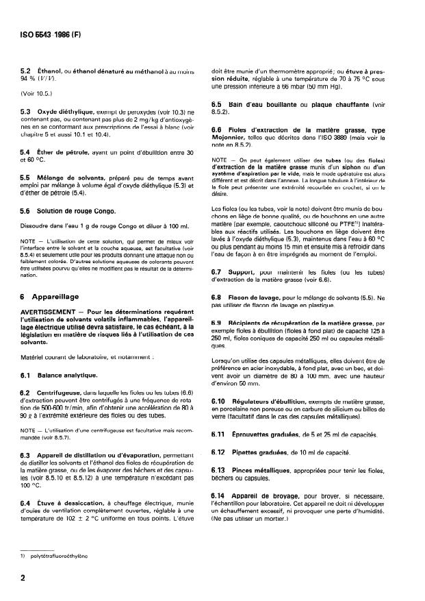 ISO 5543:1986 is a standard published by the International Organization for Standardization (ISO). Its full title is "Caseins and caseinates — Determination of fat content — Gravimetric method (Reference method)". This standard covers: La présente Norme internationale spécifie la méthode de référence pour la détermination de la teneur en matière grasse de tous les types de caséines et caséinates.