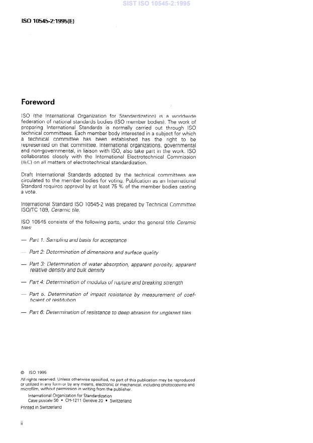ISO 10545-2:1995 is a standard published by the International Organization for Standardization (ISO). Its full title is "Ceramic tiles — Part 2: Determination of dimensions and surface quality". This standard covers: Describes methods for determining the dimensional characteristics (length, width, thickness, straightness of sides, rectangularity, surface flatness) and the surface quality of ceramic tiles. Spacer lugs, glaze blobs and other irregularities shall be ignored.