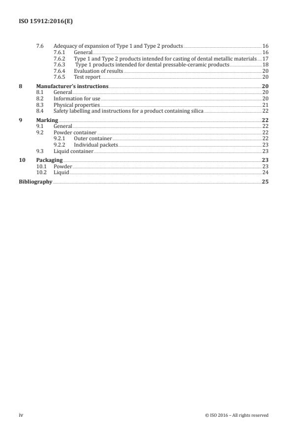ISO 15912:2016 gives requirements and test methods for determining the compliance of dental casting investment, dental brazing investment, dental pressable-ceramic investment and dental refractory die materials used in the dental laboratory, regardless of the composition of the refractory powder, the composition of the binder, or the particular application. ISO 15912:2016 classifies such products into types and classes, according to their intended use and the burn-out procedure recommended by the manufacturer. It also gives requirements for marking, labelling and manufacturer's instructions. It specifies requirements for the essential physical and mechanical properties of the products and the test methods to be used for determining them. NOTE 1 Compliance with all of the requirements presented in Clause 5 may not be necessary for some products, and a requirement might not be applicable to a product with a particular binder chemistry or be intended for an application in which that requirement is irrelevant. When this is the case, a clear statement to this effect is given according to Clause 5. NOTE 2 A specific quantitative requirement for setting expansion is not included in this International Standard. If the setting expansion of gypsum-bonded investment is measured, then the procedure given in ISO 6873[1] can be considered ? a procedure not recommended, however, for investment materials with other binders.