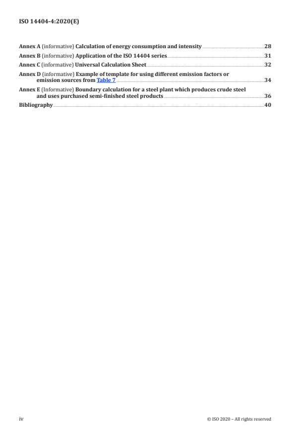 ISO 14404-4:2020 is a standard published by the International Organization for Standardization (ISO). Its full title is "Calculation method of carbon dioxide emission intensity from iron and steel production — Part 4: Guidance for using the ISO 14404 series". This standard covers: This document provides guidance for calculating the CO2 intensity at steel plants with all types of process routes, by defining the boundary, CO2 emission factors and the intermediate products for which upstream emissions are considered for all types of process routes. In particular, this document provides guidance applicable to the ISO 14404 series to the types of steel plants listed below. This document also includes the Universal Calculation Sheet, which covers all relevant emission sources from ISO 14404-1, ISO 14404-2 and ISO 14404-3 to assist the calculation of CO2 emissions. i. Steel plants with different process routes from ISO 14404-1, ISO 14404-2 and ISO 14404-3 (7.2.1) ii. Steel plants with more than one process route (7.2.2) iii. Steel plants purchasing pig iron from the outside (7.2.3) iv. Steel plants and rerollers purchasing part or all of crude steel from outside (7.2.4) Moreover, this document provides additional guidance to the entire ISO 14404 series for the following topics. a) Evaluation of exported slags b) Evaluation of by-product gas c) Evaluation of stock d) Selection of calorific values and emission factors for electricity and fuel Conversion to energy consumption and to consumption efficiency can be obtained using Annex A. While the use of the calculation result is outside the scope of this document, appropriate applications and inappropriate application are recommended in Annex B.