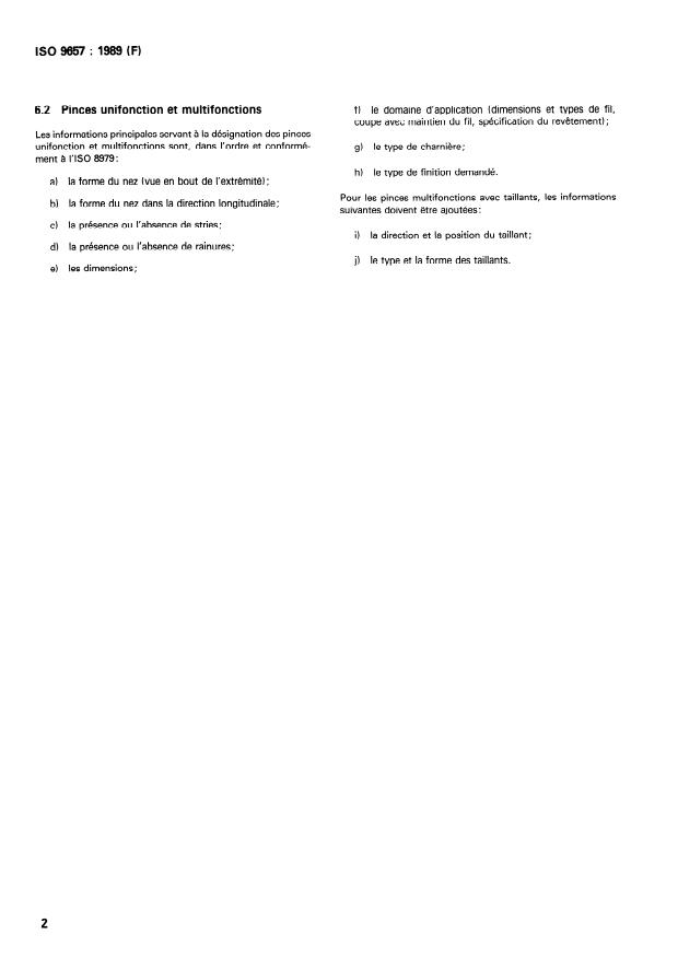 ISO 9657:1989 is a standard published by the International Organization for Standardization (ISO). Its full title is "Pliers and nippers for electronics — General technical requirements". This standard covers: Specifies the general technical requirements to be met by pliers and nippers for electronics. They are intended for use on electronic components, printed circuit boards, etc. Certain terms are defined in ISO 5742. ISO 9657 does not apply to tools intended for working on live electrical circuits and for antistatic applications.
