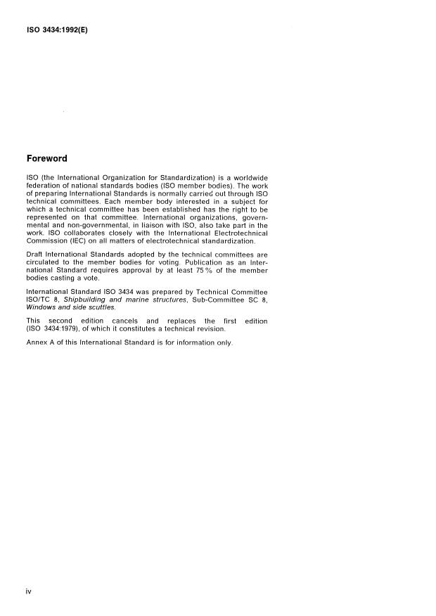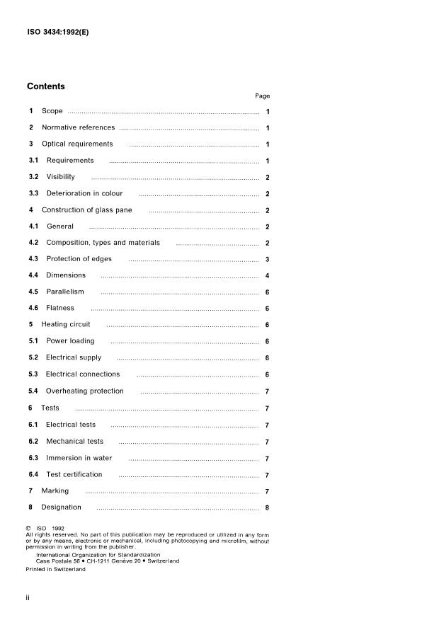 ISO 3434:1992 is a standard published by the International Organization for Standardization (ISO). Its full title is "Shipbuilding and marine structures — Heated glass panes for ships' rectangular windows". This standard covers: Specifies the characteristics and the conditions with which they shall comply to ensure the safety of ships in times of frost or snow, particularly during manoeuvres in port.