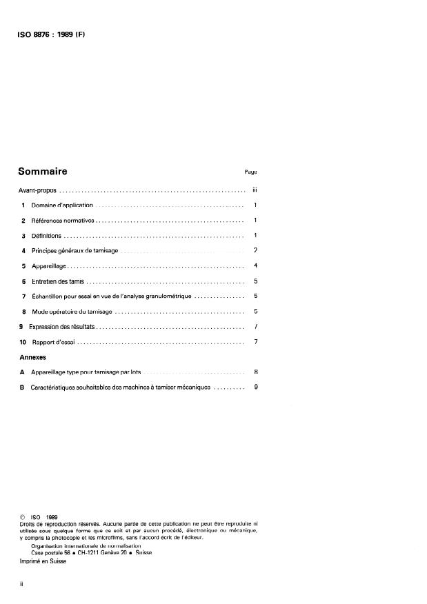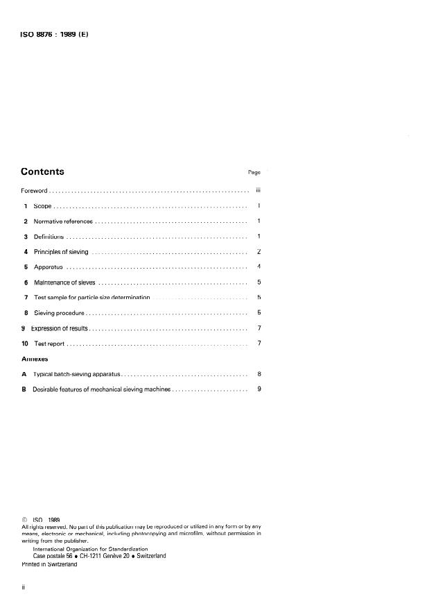 ISO 8876:1989 is a standard published by the International Organization for Standardization (ISO). Its full title is "Fluorspar — Determination of particle size distribution by sieving". This standard covers: Presentation of a basic method of sieving analysis including the definition of terms and a guide to principles of sieving, sieving procedure, expression of results, a decision tree and several examples of sieving apparatus assembly.