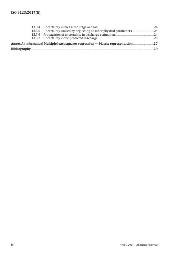 ISO 9123:2017 is a standard published by the International Organization for Standardization (ISO). Its full title is "Hydrometry - Stage-fall-discharge relationships". This standard covers: ISO 9123:2017 specifies methods for determining stage-fall-discharge relationships for a stream reach where variable backwater occurs either intermittently or continuously. Two gauging stations, a base reference gauge and an auxiliary gauge are required for gauge height measurements. A number of discharge measurements are required in order to calibrate the rating to the accuracy required by this document. The preparation of rating curves is not described in detail in this document. NOTE For a more detailed description of preparing rating curves, see the methods described in ISO 1100‑2.