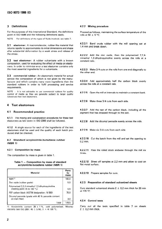 Provides formulations, mixing and vulcanization procedures for three types of elastomeric compositions: acrylonitrilebutadiene rubber (NBR 1); fluoroelastomers (FPM 1); ethylene propylene diene rubber (EPDM 1). The normative annex A gives a prediction of percentage change in volume of commercial rubbers in mineral-based oils. The normative annex B gives a rapid method for indicating the effect of mineral-based oils on elastomers by measuring volume change index. Annex C includes the information report.