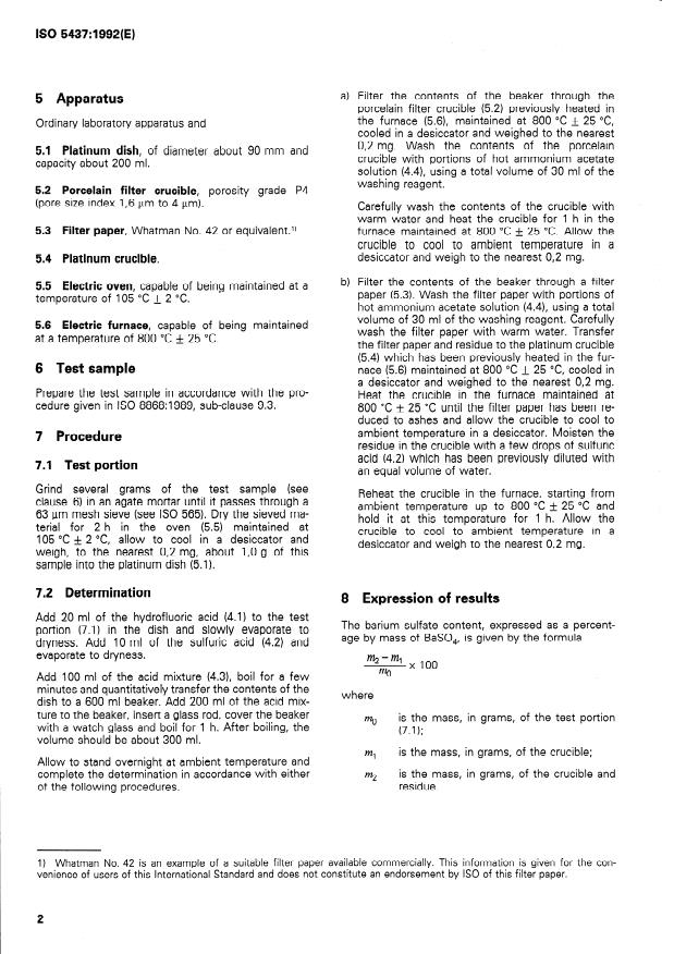 ISO 5437:1992 is a standard published by the International Organization for Standardization (ISO). Its full title is "Acid-grade and ceramic-grade fluorspar — Determination of barium sulfate content — Gravimetric method". This standard covers: The method is based on evaporation to dryness of a test portion in the presence of hydrofluoric acid and concentrated sulfuric acid, extraction of the soluble salts from the mixture, filtration, drying and weighing of the residual barium sulfate. Applies to products having barium sulfate contents equal to or greater than 0,1 % (m/m).